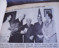 Retiring Police Chief William Brown receives a gold watch for his years of service from Jack Young, Police Commission, IHS4190