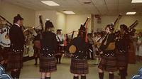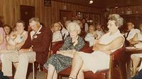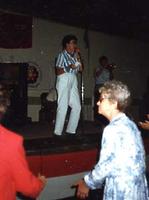Photo taken during the Cookstown Reunion in 1984 showing Pat Kidd Bertles on stage holding a microphone. Standing in,