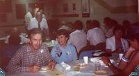 Photo of John and Lois Leadlay at the Cookstown Reunion in 1984. They are seated for dining at a long table and a number,