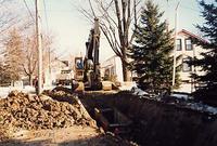 Photo of an excavator digging on John Street East in Cookstown to install a water line.