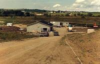 Colour photograph of a construction site on a dirt road, showing several grey buildings, parked vehicles, and