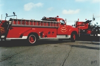 Photo of a red fire engine taking part in the Cookstown Fair Parade in 1987.,