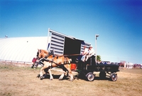Photo taken during the 1991 Cookstown Fair showing three men riding in the front seat of a wagon, drawn by two light