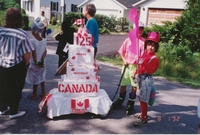 Photo taken during the 1992 Alcona Beach Club parade showing a small float in the shape of a cake that reads "Happy