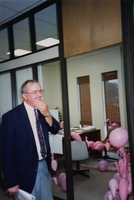 Merv Wice smiling after seeing his staff has surprised him by filling his office with pink plastic flamingos and pink