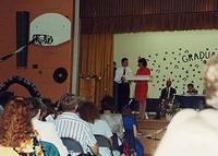Mrs. Beryl Stimpfig receives a gift from Matt Friesen at an eighth grade graduation in 1992 at Cookstown Central Public