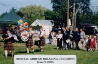 Photograph of a pipe and drum band marching in Innisfil dignitaries to the site of the official ground breaking for the