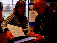 Photograph of Major Barbara Baguley signing Veteran John Battle's “Innisfil Veterans: Their Lives and Memories” book at, 4455