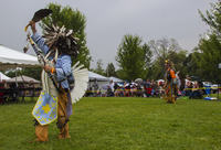 Image of a dancer in motion holding an eagle feather aloft at the 2017 Celebrate Lake Simcoe Pow Wow at Innisfil Beach