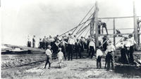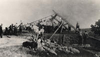 Image taken in June 1932, of a barn raising at Mr. and Mrs. Cyril's farm. People can be seen in the image beginning to, IHS1458