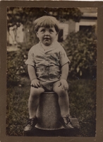 A portrait of Clifford Reeves as a young child, sitting on a bucket, outdoors.