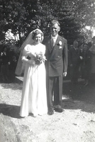 Photograph of newlyweds Dorothy Pratt and Parker Peacock outdoors with their wedding guests in the background.