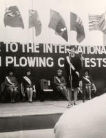 Photo of Margaret Cowan (daughter of Frank and Blanche Cowan) as Queen of the Furrow for South Simcoe, giving a speech, IHS748B