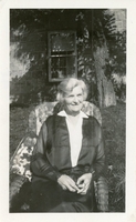 Photo of Maria Louisa Barclay seated in a wicker chair outside of her home, the Barclay house. She is an older woman