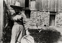 Mrs. William Latimer in the barnyard doing chores typical of a farm wife in the early twentieth century., IHS2393