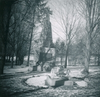Front view of the Cookstown cenotaph and mortar gun, with a ring of stones surrounding the gun and some wreaths visible