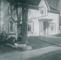 Picture of a white stucco house with centre entrance and lovely windows, treed yard, and dormer, which served as a home