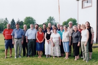 A photograph including six agricultural members around a picnic table - three are sitting and three are standing. The
