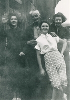Photo shows an older gentleman, Will Harris, with his daughters Reta, Fran, and Mary taken outdoors.