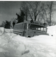 Photo of a very snowy landscape with a school bus in the ditch or snowbank.