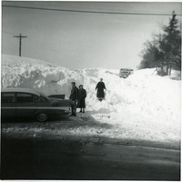 Photo of three people, two of whom are Norman and Alice Baker, with a vintage car on a roadway with huge snow banks in