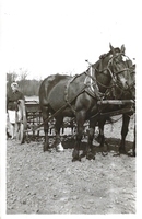 Dorothy Pratt standing behind horses, pulling a plow, in a field. Pratt is wearing a skirt, jacket, and has a scarf tied