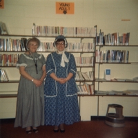 Two women dressed in mid 19th century costumes, in the Stroud Branch of Innisfil Public Library. They stand in front of