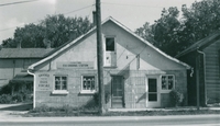 Wooden building with overhanging roof over front entrance, attached garage. Identified as Lloyd Hughes' store and the