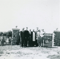 Photo of a group standing in front of the stone pillars and wrought iron fencing of the entrance to a Cookstown cemetery