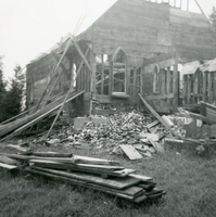 Photo of Braden's Presbyterian Church midway through demolition with rubble and wood plans surrounding the building.