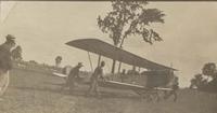 Postcard showing one of the first airplanes. The image shows an airplane in a field, being pushed either side on the, IHS3829