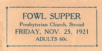 Ticket for a fowl supper held at the Presbyterian Church in Stroud on Friday, 25 November, 1921. The ticket also notes