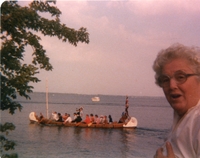 Photo of a woman with white hair and glasses, likely Mary Wilson, admiring the paddling of a long canoe by numerous