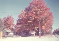 Colour photo taken in the late 1970s in the autumn of the gas pumps at Wilson's Store in Alcona. A large Shell sign is