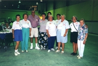 Colour photo of the organizers of the Stroud School reunion held at the Stroud Curling Club on the ice surface in August