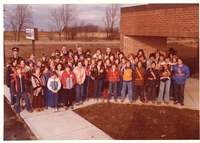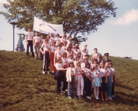 Colour photo taken at the Ottawa Safety Patroller Rally circa 1980 of a group of people standing in front of some trees.