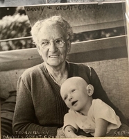 Photo of Emma Cooke holding her great-grandson Danny. She is wearing a wool sweater and glasses, and a handwritten