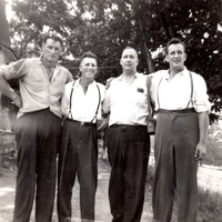 Black and white photo of Nac, Jack, Bill, and Blake Constable taken in June 1949 at the 7th Line farm.