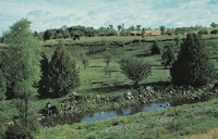 A postcard of Bonsecours in Innisfil depicting a stream running through a grassy area dotted with trees. Bonsecours