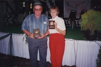 Image of a man (left) identified as Riley, and woman (right) idenitfied as Mabel Jobee, holding awards for long time