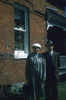 Colour photo of Helen & Harold Wallace taken on Mother's Day. They are standing outside a red brick home. Helen is