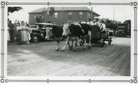 Black and white photo of two oxen named Buck and Bright belonging to Edward Guest pulling a wagon in a parade sometime