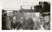 Black and white photo of seven men standing in front of some machinery or equipment, no date or location specified.