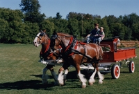 Image of two draft horses harnessed and pulling two people a red wagon. Sitting on the wagon is a man dressed in jeans
