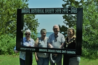Photo of Marian Harris, Marion and Bruce Somers, and Mayor Lynn Dollin standing inside a specially designed life-sized