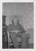 Black and white photo of Robert Lamb seated in a wooden armchair. Lace curtains and floral wallpaper are visible behind