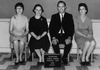 Black and white photo taken in June 1958 of three people seated on a couch. From left to right are Luella Sharp, her