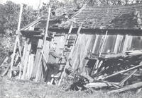 Jean Warrington (née Jacks) climbs a ladder along the side of a shed on David Jack’s farm. The shed leans slightly, IHS553 same as IHS158