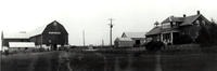 Black-and-white panoramic photograph of the Burnside farm. On the left is a large barn with “Burnside” lettered on its, IHS815