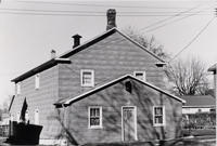 Black and white photograph of two adjacent buildings in a grassy yard. The one on the left is a small, gable-roofed, IHS4323